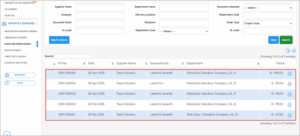 - Press Search. The purchase orders with the data matching the criteria in the Advanced Search fields are displayed and the summary of the purchase orders will be updated depending on the filter result.